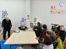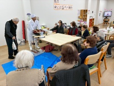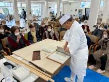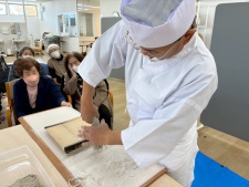 これまでも調理師さんが蕎麦打ちをみせてくれたことがありましたが、Wさんははっきりいってプロ以上の腕前でした。蕎麦打ちの道具から所作、工程、こだわり、そして観客を巻き込む説明のうまさなど、圧倒的な技術で、観客となった利用者さんみんな引き込まれてしまいました。